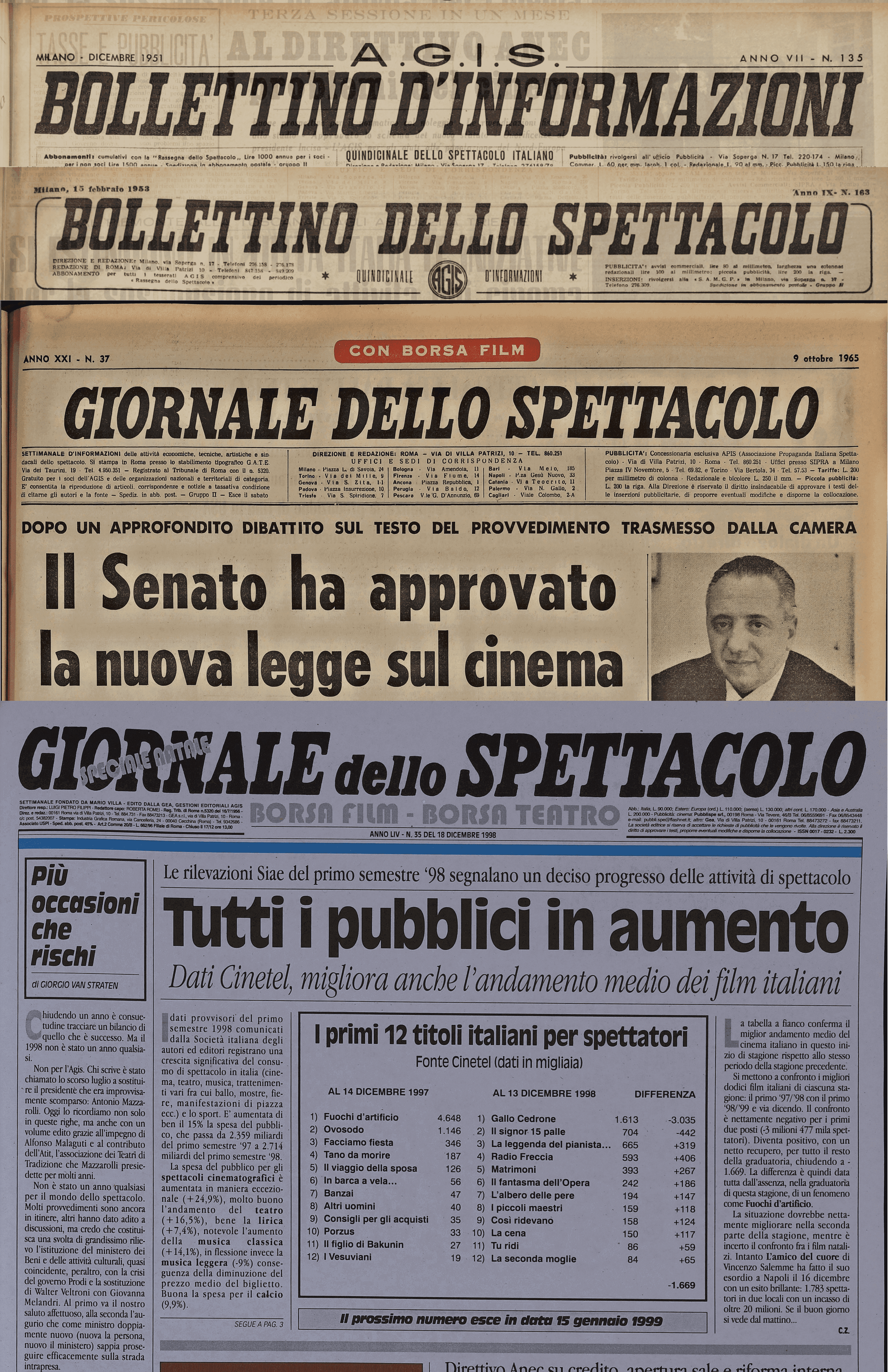 Sono solo alcuni degli spunti che sono custoditi all'interno dei numeri storici conservati del Giornale dello Spettacolo, finora consultabili solo negli archivi nazionali e associativi e che adesso escono dalla “polvere del tempo” per essere affidati alla consultazione di professionisti del settore, studiosi, ricercatori, laureandi e anche semplici amanti della cultura attraverso la loro completa digitalizzazione, a partire dal 1955.